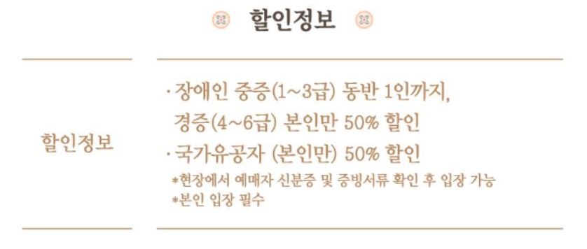 - 장애인 중증(1~3급) 본인 포함 2인 50%할인/ 장애인 경증(4급 이하), 국가유공자 본인 한정 50% 할인