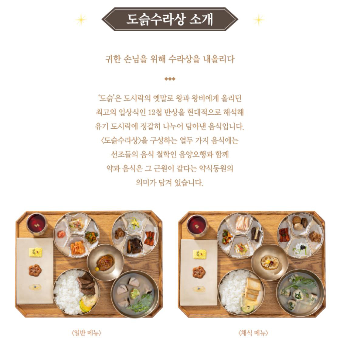 궁궐의 부엌인 ‘소주방’에 들러 조선의 왕이 먹던 일상식인 12첩 반상을 현대적으로 재해석한 ‘도슭수라상’을 맛보게 됩니다. 맛있는 수라상을 먹는 동안 국악공연이 함께 펼쳐져 맛과 멋의 풍류로 가득한 밤이 될 것입니다.