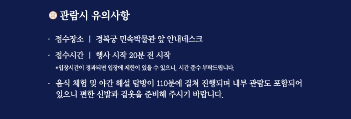 - 경복궁 별빛야행 야간 해설탐방이 약 110분에 걸쳐 진행되며 내부 관람도 포함되어 있으니 편한 신발을 착용해주세요. 플래시와 삼각대는 사용이 불가하며, 음식물 반입 금지입니다.