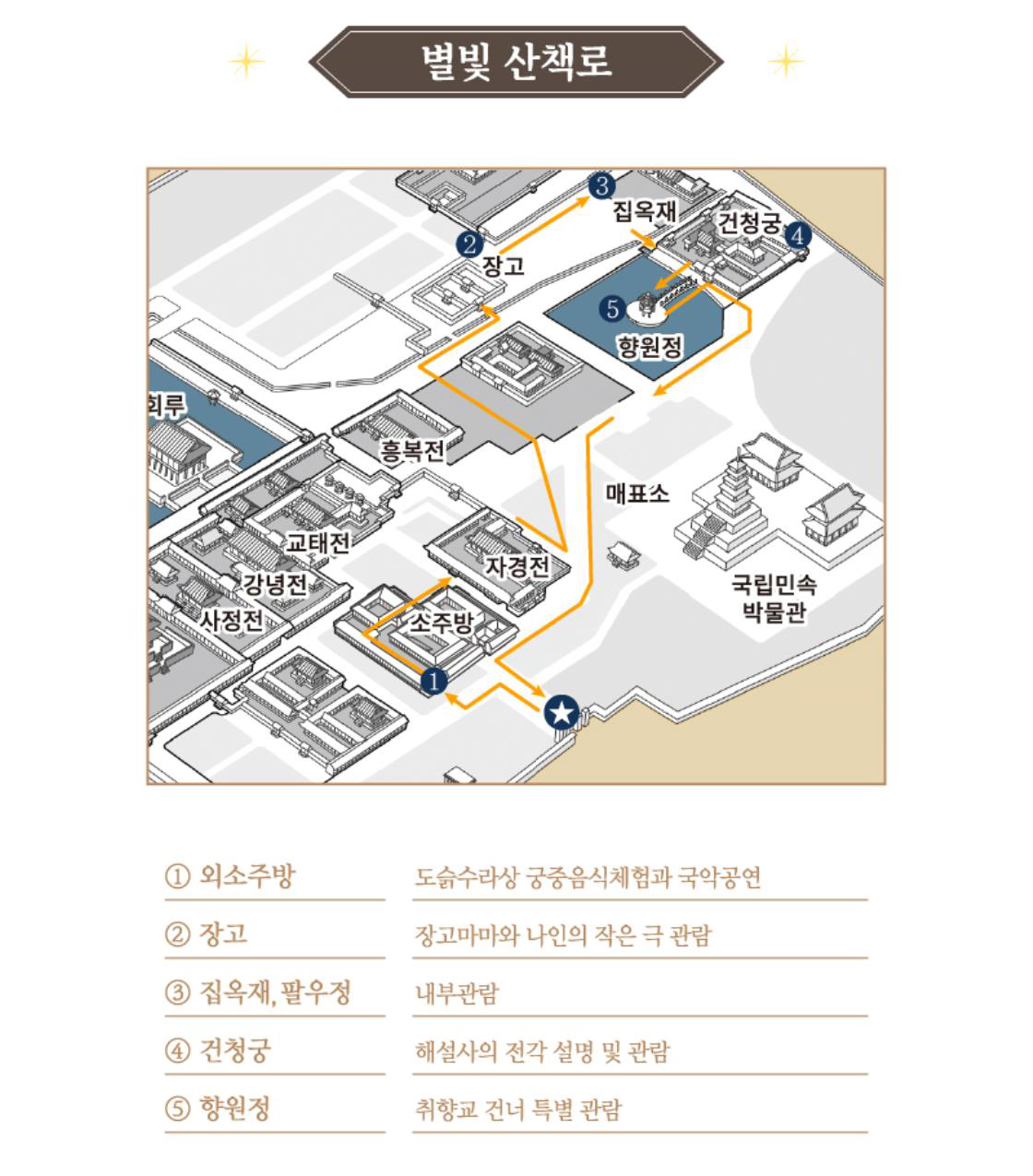 ①국립민속박물관 앞(집결) → ②외소주방(궁중음식 체험 및 국악공연 관람) → ③장고→ ④집옥재·팔우정 → ⑤건청궁 → ⑥향원정